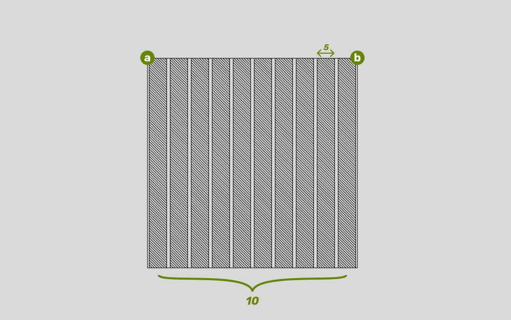 let x = a + spaceWidth / 2;First, we set our total number of columns to 10 and a columnSize of 5. This columnSize isn't a pixel value; it's a ratio. It means that each column will be 5 times wider than the gutter.
